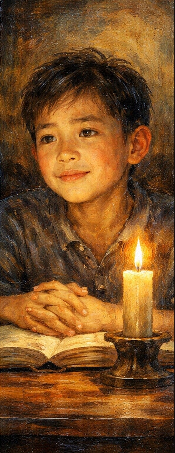 At last, the flame burns steady, and so does he. His posture grows straighter, his breathing quieter, as though he has crossed a river inside himself and arrived on a different shore. The candlelight still dances in his eyes, but now it reflects not just sadness, but a quiet understanding. He looks older in this moment—not because he has grown tall, but because he has learned to carry his emotions with a gentle, hard‑won grace.